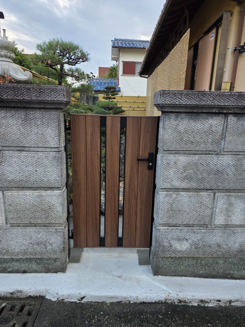 新しい門扉は、操作性の高い鍵を採用し、毎日の開閉がスムーズで安心に。勝手口も同じデザインで統一感を出し、防犯性を高めました。
