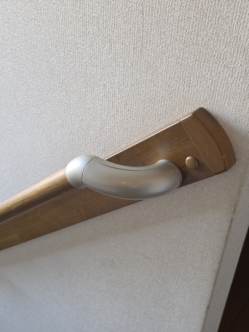既存と同じTOTO製の中から、より快適に進化した『サザナ』をご提案。娘様が安全に移動・入浴できるよう、必要な箇所にしっかりとした手すりを追加設置しました。また、劣化していた階段登り口の手すりカバーも交換し、掴みやすく清潔な状態へと整えました。