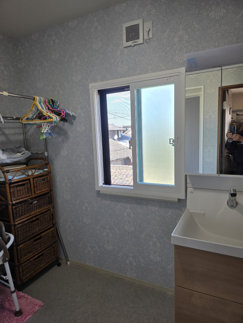 洗面所はクロスとクッションフロアを貼り替え、パッと明るい空間へリフレッシュ。さらに補助金制度を賢く活用し、洗面所の窓には内窓(LIXIL インプラス)を設置。冬場のヒートショック対策とともに、家計にも優しい断熱改修を実現しました。