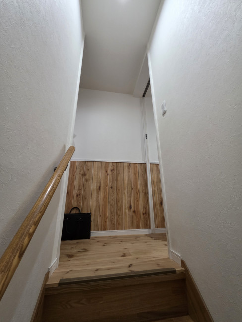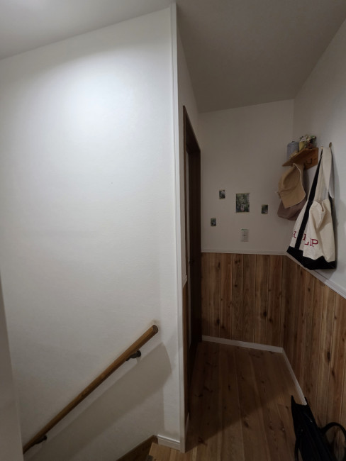 ドアがなく開放的な階段上り口。猫ちゃんの安全確保が課題でした。