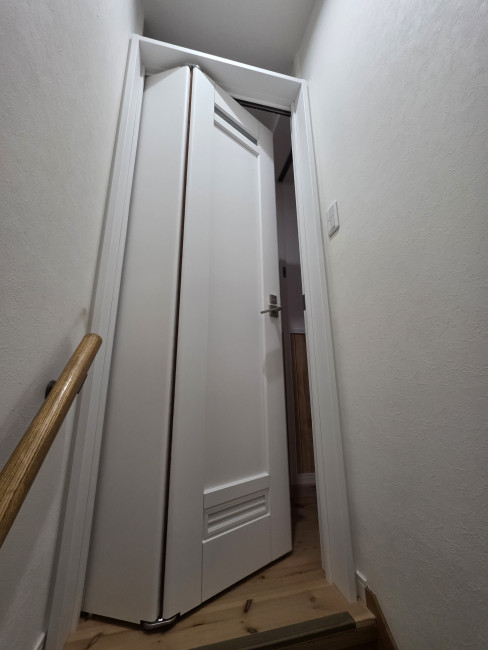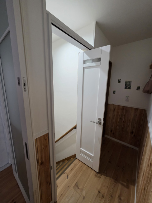 通常の開き戸だと開閉時に大きなスペースが必要になりますが、今回は『ラシッサS』の中折れドアを採用。コンパクトに畳めるため、階段付近の限られたスペースでもスムーズに通行可能です。また、上部を塞がずドア本体のみを施工することで、コストを抑えつつ目的を達成しました。