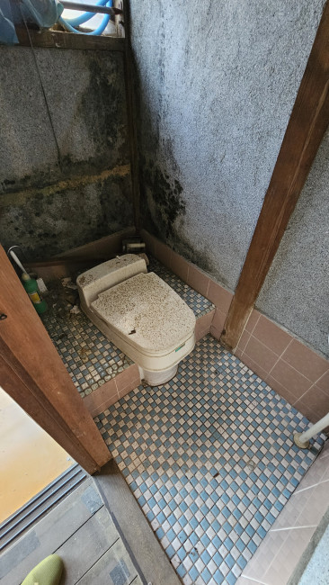 床の抜け落ち、傾いたベランダ、汲み取りトイレなど、人が住むには厳しい状態でした。