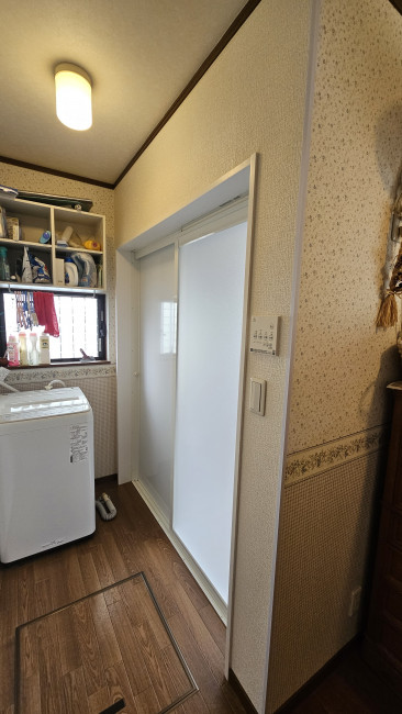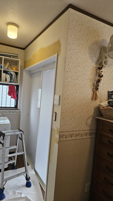 浴室の入れ替えに伴い、洗面所の壁紙はドア周りのみに限定して張り替え。コストを抑えつつ、リフォーム後の見た目の美しさを損なわない「かしこい選択」をお客様と一緒に作り上げました。