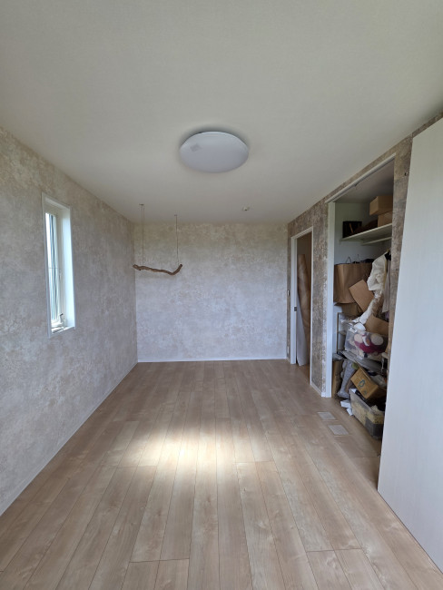 子供部屋の施工に合わせ、1階物入(約2帖)の内部も天井・壁ともにクロスを新調。普段目につきにくい収納内部を明るく整えることで、新生活の始まりにふさわしい、清潔感あふれる住まいへとアップデートしました。