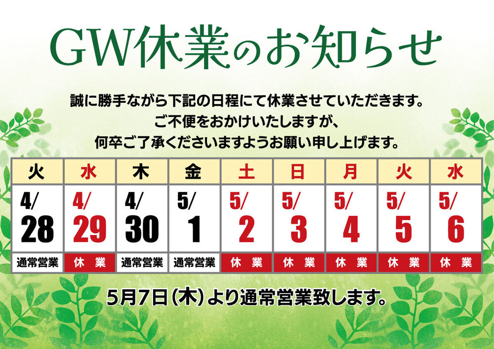ゴールデンウィーク期間の休業日のお知らせ